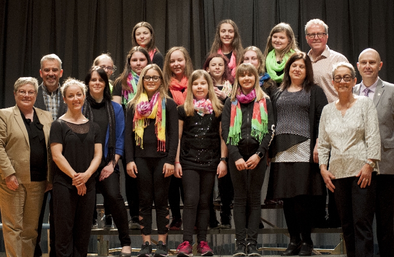 de gauche à droite, la ministre Francine Landry, le maire d'Edmundston Cyrille Simard, l'artiste Chantal Baudouin qui participe aux ateliers-rencontres, Julie-Christine Ouellet, directrice de la Chorale de la jeunesse, les élèves de la chorale, la Directrice de l’école Carrefour de la jeunesse Renée Couturier, J Daniel Martin agent pédagogique au District scolaire francophone du Nord-Ouest, la directrice générale de l'Assocaition acadienne des artistes professionnel.le.s du Nouveau-Brunswick Carmen Gibbs et le Directeur général du District scolaire francophone du Nord-Ouest Luc Caron. Photo: Geneviève Violette