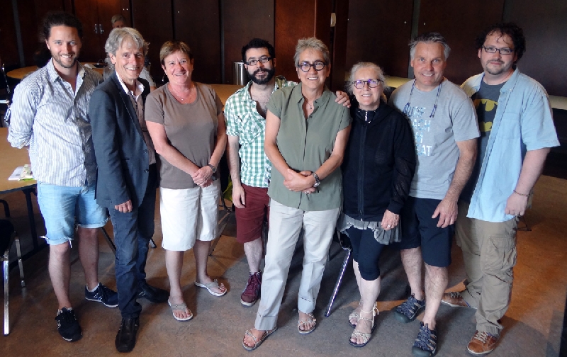 De gauche à droite: Jean-François Duke (danse), Philippe Beaulieu (président), Christiane St-Pierre (littérature), Marc-André Charron (théâtre), Carmen Gibbs (directrice générale), Marie Ulmer (Sud), Jacques Rousseau (Nord-Ouest) et Samuel Caron (arts médiatiques). Absent.e.s: René Poirier (vice-président), Mélanie Léger (secrétaire-trésorière), Nicole Haché (Nord-Est), Julie Caissie (arts visuels).