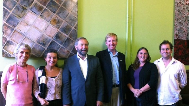 De g à d: Philippe Beaulieu (président AAAPNB), Catherine Pinhas (conjointe de M. Mulcair), Thomas Mulcair (chef de l'opposition officielle à la Chambre des communes), Dominic Cardy (chef NPD NB), Marie-Pierre Valay-Nadeau (vice-présidente AAAPNB) et Jean-Pierre Caissie (responsable des comunnications AAAPNB) – à Moncton.