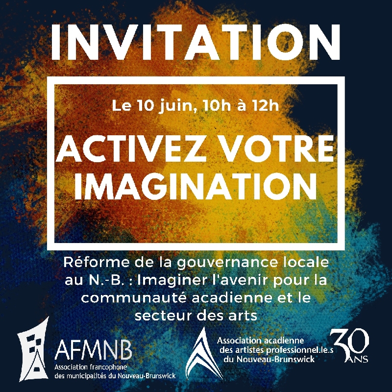 L’Association acadienne des artistes professionnels du N.-B. (AAAPNB), conjointement avec l’Association francophone des municipalités du Nouveau-Brunswick (AFMNB), vous offrent une occasion d’échanges pour mieux cerner les enjeux qui entourent la réforme de la gouvernance locale, communément appelée la pleine municipalisation.